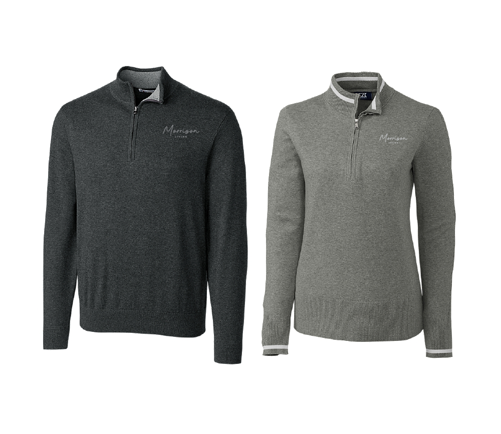 sku: MORR-61Cutter & Buck Lakemont Half-Zip Sweater. 80% Cotton/Coton, 17% Nylon, 3% Spandex. Mock neck styles for both men's and women's styles. Includes 1 embroidered logo.
